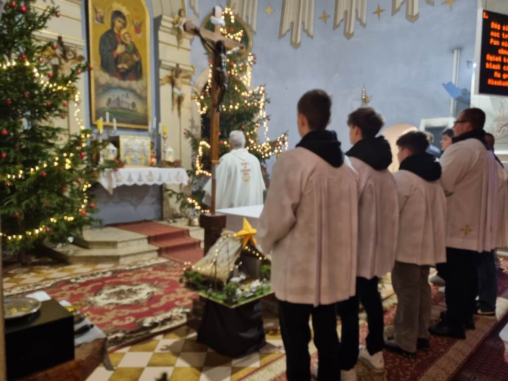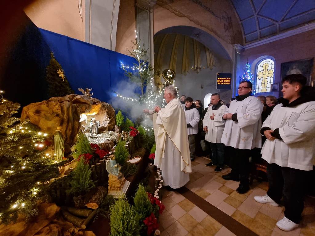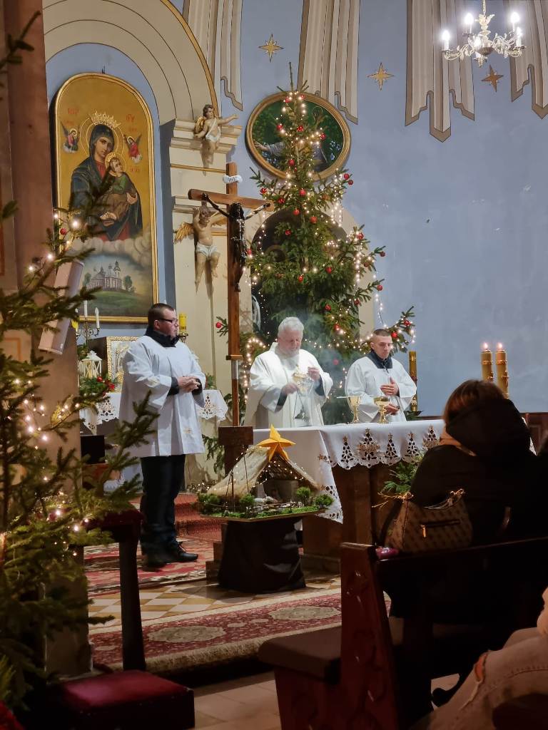 Tradycyjnie o północy odprawiona została uroczysta Msza Święta-Pasterka, upamiętniająca modlitwę i oczekiwanie na Narodzenie Zbawiciela. Zgromadzeni wierni przywitali nowonarodzonego w żłóbku Jezusa i oddali Mu cześć. W pięknie przyozdobionej choinkami Świątyni śpiewaliśmy kolędy wielbiąc Boże Dziecię.